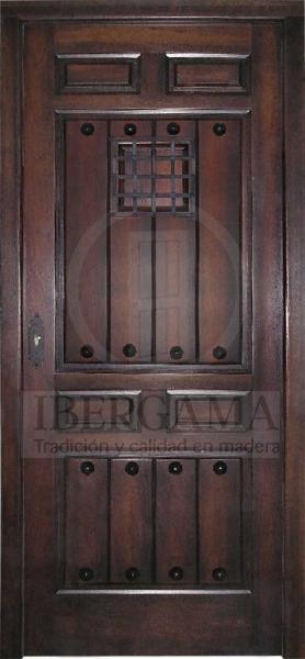 La puerta de madera maciza de alta calidad con acabado en barniz oscuro destaca por su sofisticación y diseño clásico. Compuesta por varios paneles con molduras elegantes, la puerta incluye un ventanillo cuadrado central protegido por una reja de hierro forjado con diseño cuadriculado, garantizando seguridad sin sacrificar la estética. Los detalles decorativos, como los clavos de hierro forjado, aportan un toque rústico y robusto. Con cerradura de alta seguridad y bisagras resistentes, esta puerta es duradera y resistente a las inclemencias del tiempo. Disponible en varias medidas estándar y personalizable, es ideal para entradas principales y residencias u oficinas que buscan una imagen elegante y segura.